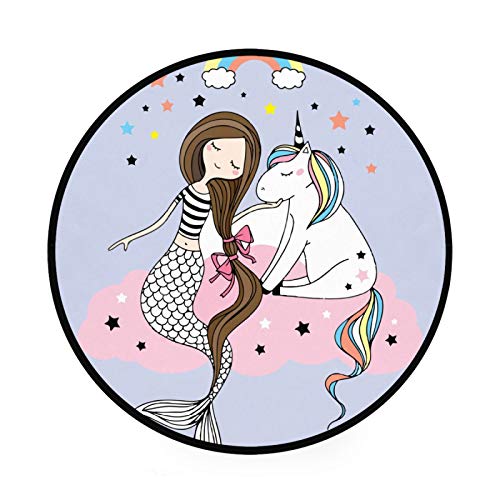 A soft unicorn rug with its round shape or oval unicorn rug and its purple background scattered with stars, rainbows and clouds... Perfect as a play area or to accommodate a small round table for drawing.